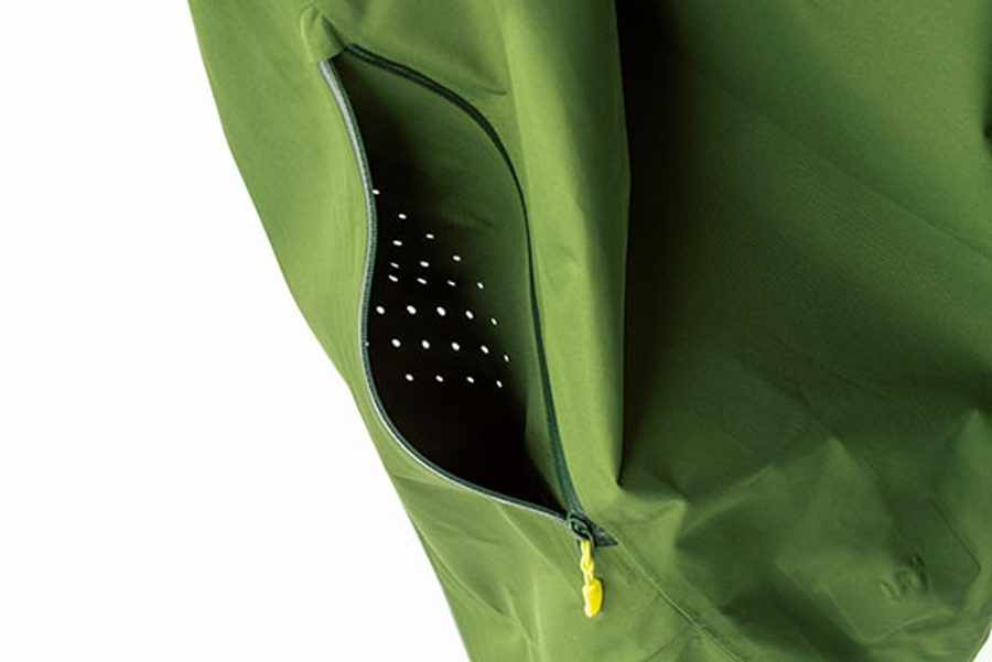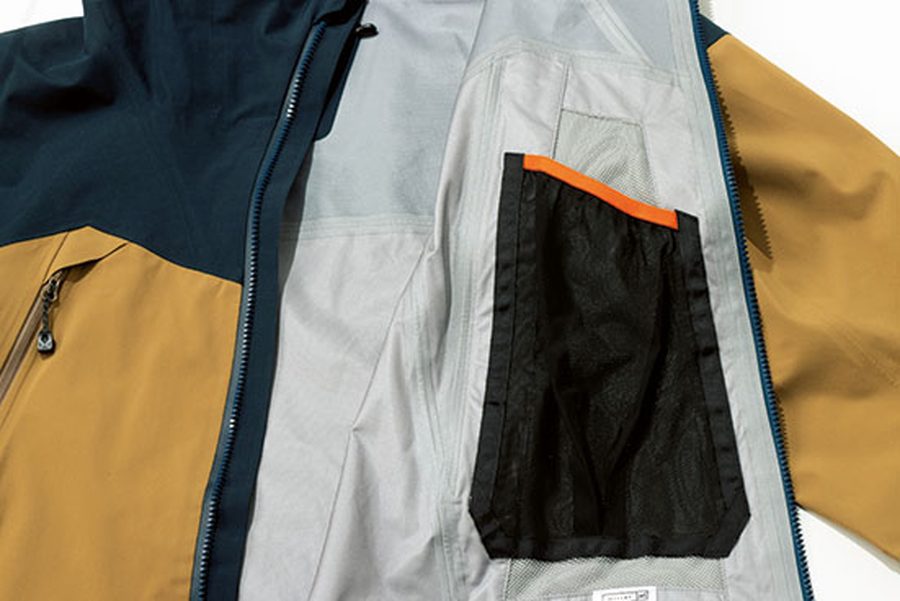 2種類のゴアテックスを使用するハイブリッド。ストレスを受けやすい場所に3レイヤー、そのほかの部分は軽量なパックライトに切り替えている。内側をメッシュにしたポケットによって物理的にもムレを軽減。