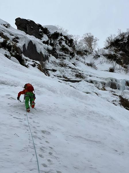 まともな蒼い氷は、どうも存在するようには見えない。ロープなしで駆け上がれそうな、ルンゼにかかるシュッとした氷がないかと密かに期待したが、それは儚い夢だった。