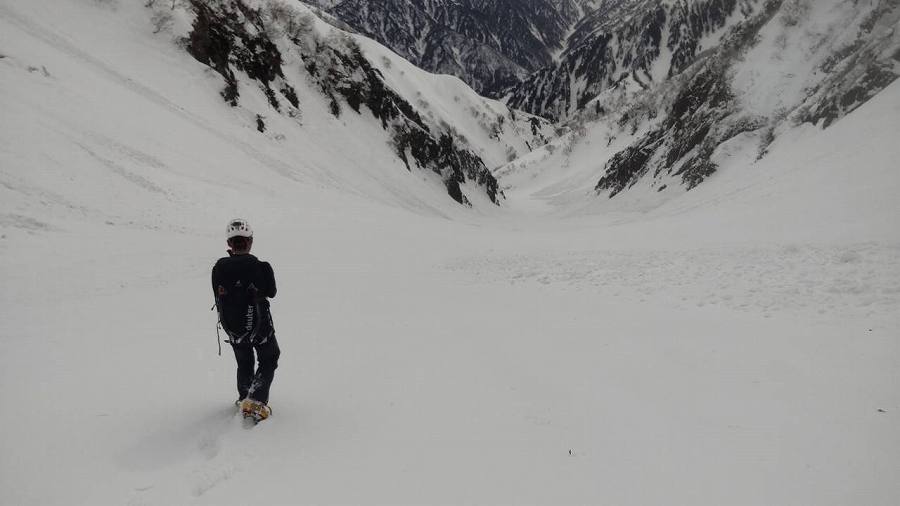 小窓雪渓は湿気たパウダーが表層に残っており、デブリもひどくない。スキーを履いていない自分たちを呪いながら二股にむけてどんどん降りる。降りるにつれて再び気温が上がっていき、パウダーはどこかに消えた。目指す滝ノ稜には氷はあるのか?