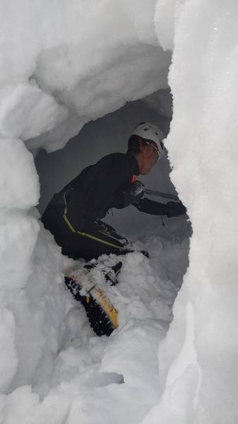 一丁のスコップで代りばんこに急斜面に横穴を掘って 1 時間で雪洞となる。ツェルトを吊るして水を作って飯を食べたが、雪洞のなかだというのにまだ明るい。年末に比べたら笑えるくらいの日の長さだ。東向きで夕焼けも見えないから、明るくとも構わず就寝。