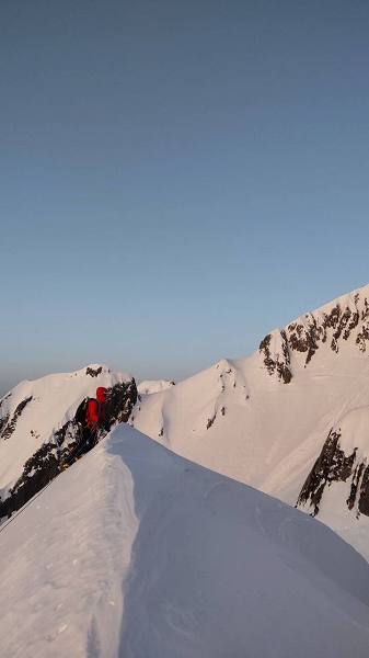 一峰に着いたときはまだ真っ暗。この辺りで夜明けと踏んでいたがやや焦りすぎたようだ。行く先も真っ暗だが、雪稜なので大概答えはひとつだから迷うことはない。
