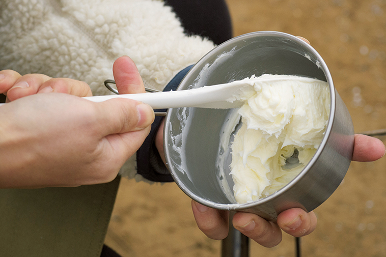 材料を混ぜたら、あとは焼きっぱなしで作れるのがバスクチーズのメリット。本来は冷まして食べるケーキですが、寒い日のキャンプではできたて熱々をスプーンですくって食べるのも美味しいと思います。