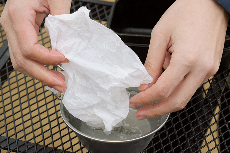 2.オーブンペーパーを水に浸して丸めて、シワをつける。水気を軽く絞ってメスティンに敷き込む。いったん濡らすことで型に敷きやすくなり、紙の焦げ防止にもなるので忘れずに。