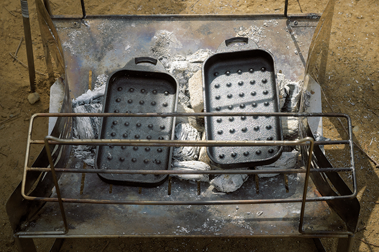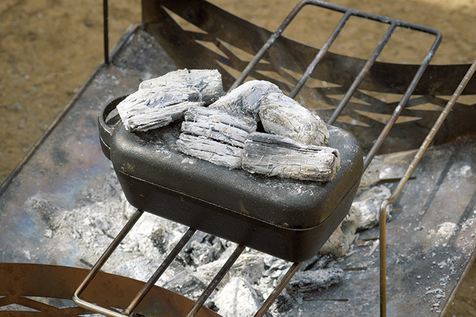フタをプレヒートしてから使うと、美しい焼き色がつく。火加減は上火4 下火3くらいのイメージで焼こう。