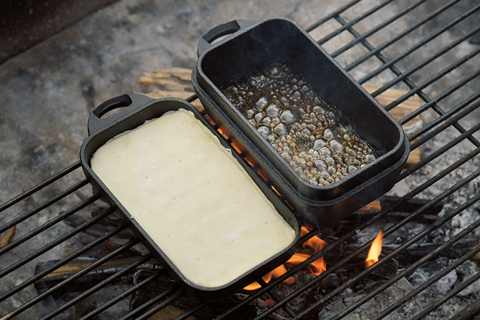 5.火から下ろし、❷のパイを乗せる。粗熱が取れたら、氷を入れた大きめのボウルかバットにメスティンを入れて一気に冷やす。