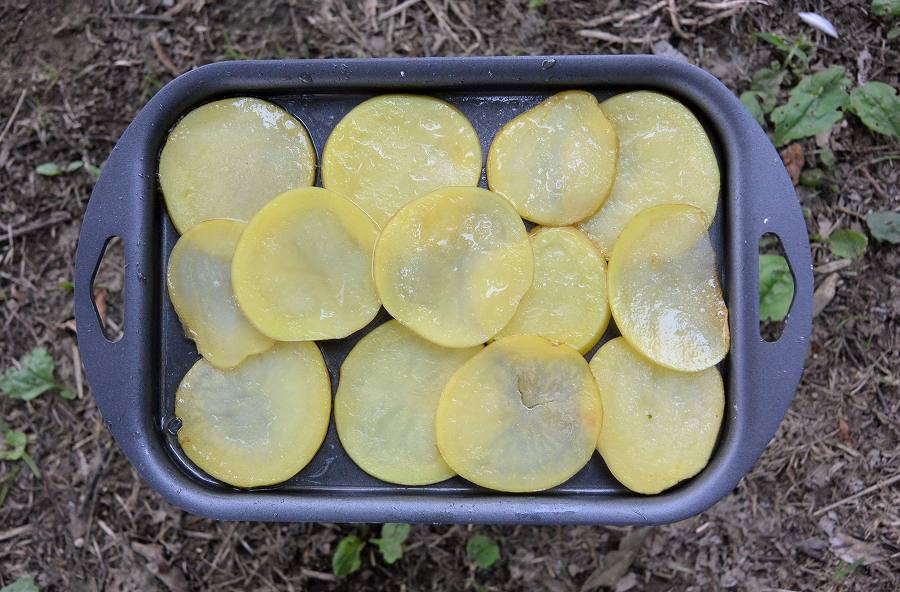 スライスしたジャガイモを両面しっかりと焼き、プレートに敷き詰めます。
