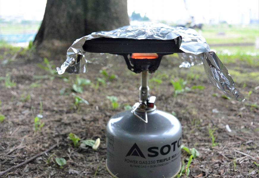 具材にしっかり火をとおすためにフタをします。フタに便利なのがアルミホイル。プレートより大きめにカットして、少し巻き込むようにフタをします。焦げ付かないように火加減は弱火~中火で5分~10分ほど加熱します。
