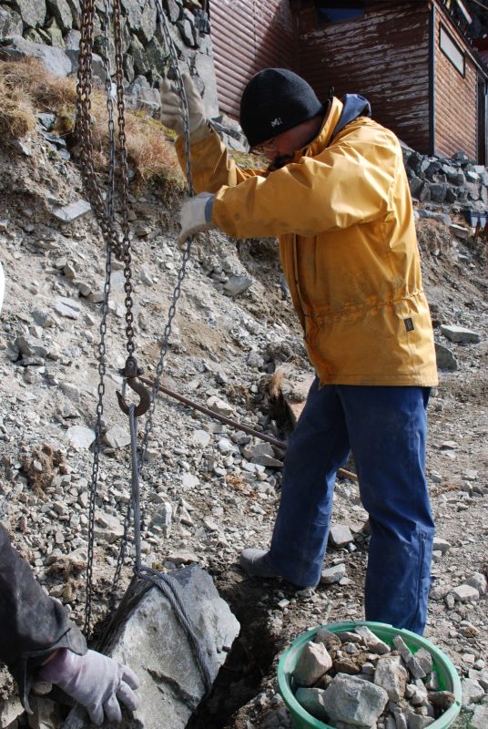 私たちは懸念のスラブの谷側に、ドリルで穴を空け自立する杭を打った。そこにツーバイ材を番線で固定した。さらに山側にも同様の加工を施して、手すりとなりそうなロープを強張した。これにより両側に手をかける固定物ができ、ハイマツコーナーは安全になった。