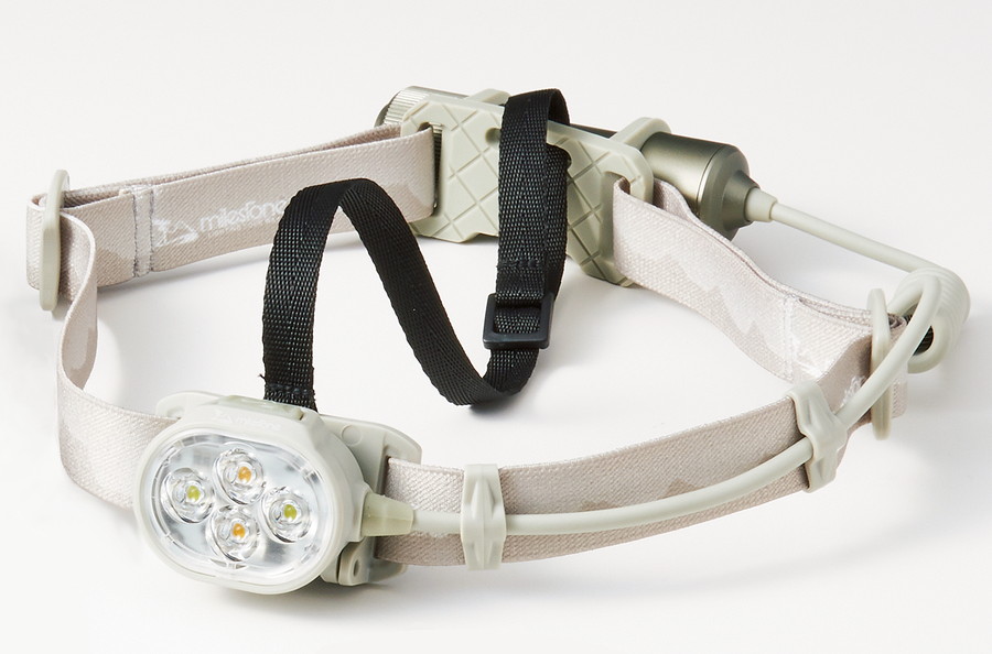 ブランドを象徴する電球色LEDと、多くのヘッドランプで採用される白色LEDを十字に配置。霧や雨天時でもトレイルの視認性のよさを確保。付属の専用充電池は大容量で、500lmのモードで最長8時間も点灯可能。