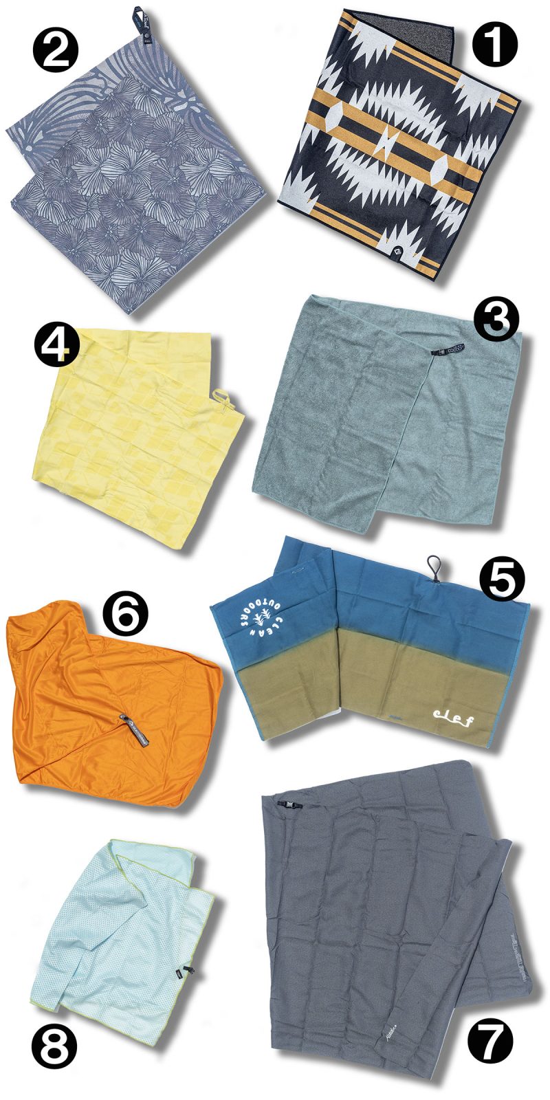今回は最新の速乾タオル8本を用意。大きさは使いやすい手ぬぐいサイズ=35×90㎝に近いものを選択。吸水性、速乾性、肌触りなどをテストした。その結果、手ぬぐい的、全身用(髪の毛の長い人用)、その中間の3種類の速乾タオルがあると感じた。大きな違いは肌触り。硬めは手ぬぐい、ソフトを全身用にと使い分けたい。