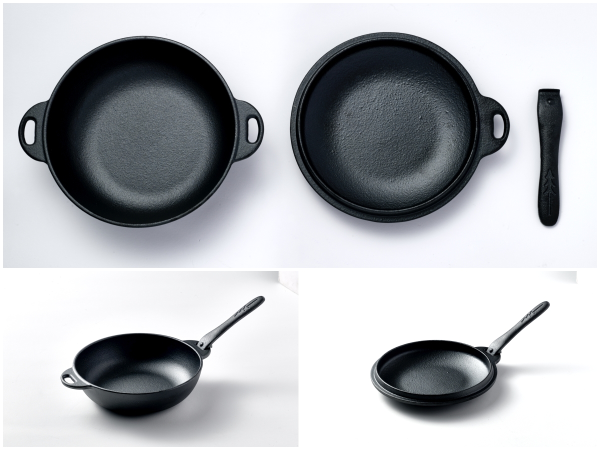重量は2.1kg! 直径約18cm、深さはたっぷり5cmで1〜2人分の調理に最適。本体とフタの組み合わせで、煮る、焼く、蒸す、炒めるなど、なんでもOK。熾火に直接放り込んでのダッチオーブンらしい使い方ももちろんできる。そして付属のハンドルは本体だけでなくフタにも対応。フライパンとしても活用できるので、焼き物やソース作りに最適。
