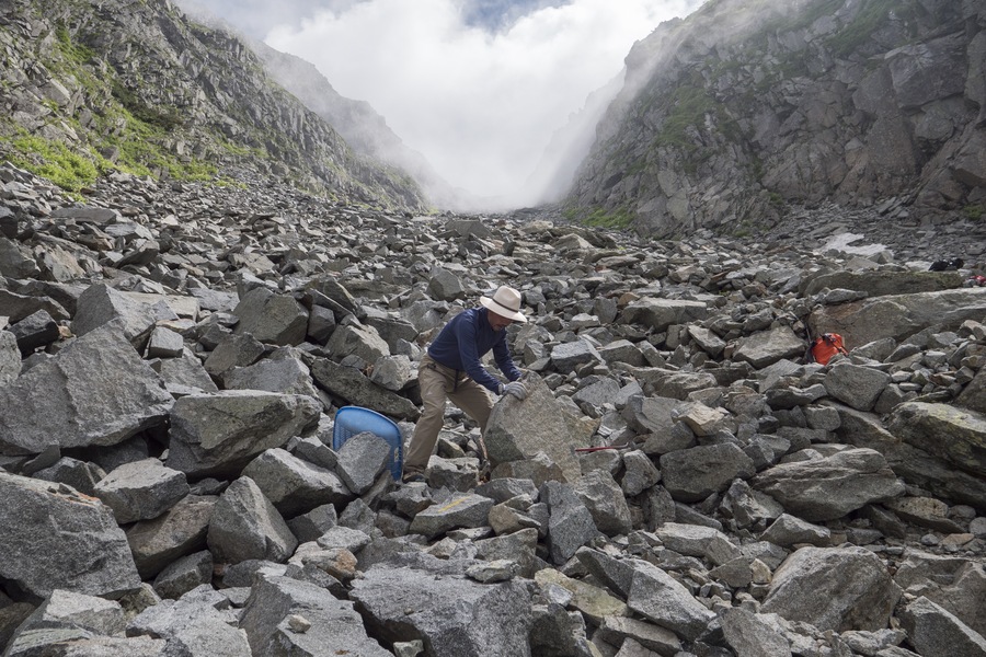 「重太郎さんの時代は当然全てボッカや。ヘリなんてあらへん。白出の真ん中に荷継小屋跡があるやろ、あそこまで当時の穂高小屋から降りてって、下から上がってきた荷物受け取んねん。そのボッカが小屋まで上がるのには当然、白出のガレ場を登らなあかんのやが、当時は岩がコトリともいわんかったそうや、そんだけ道がしっかりしとったってことや、いまじゃ考えられんけどな。下のほうなんかいまやただのガレ場や」