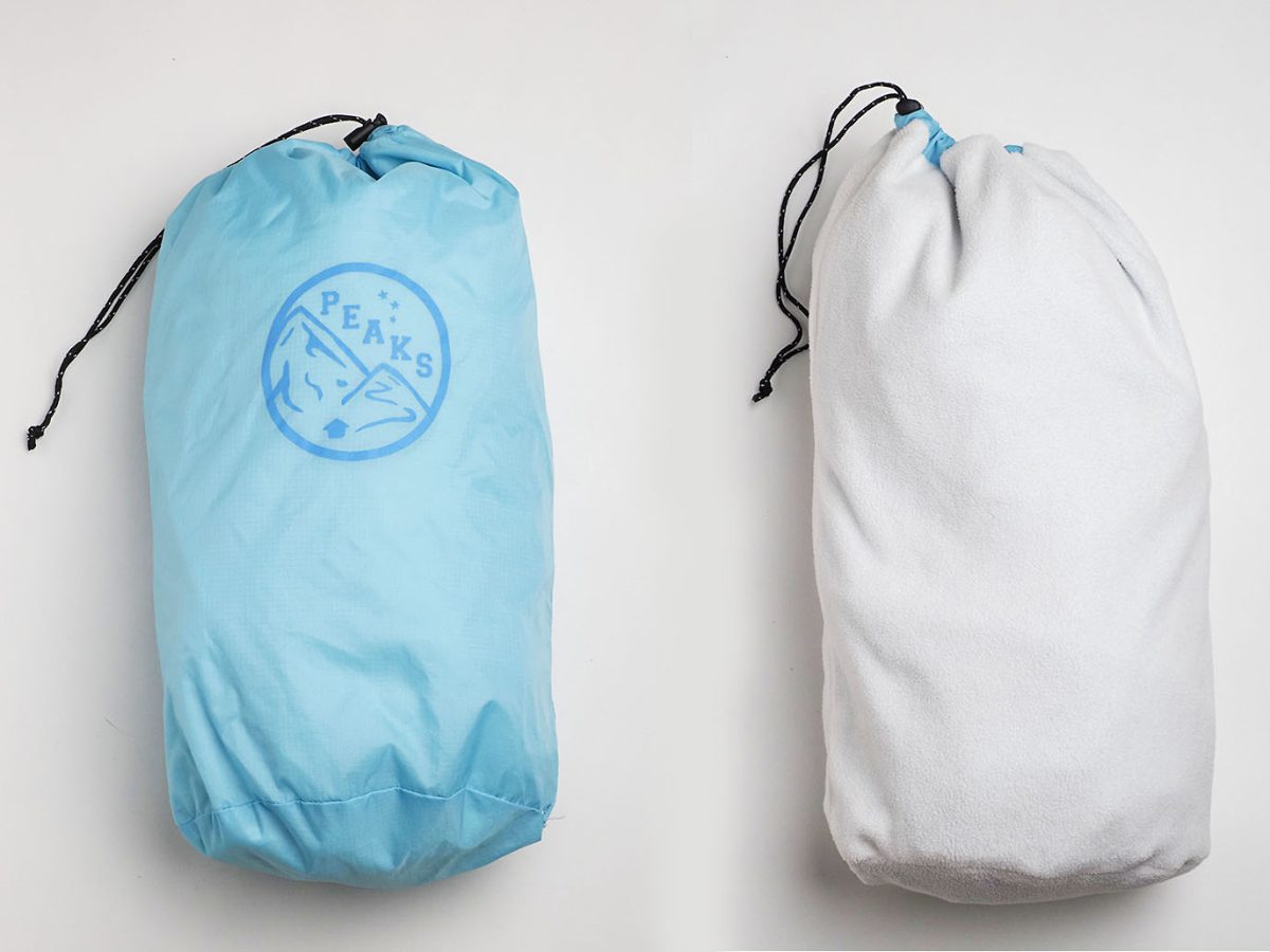 一見ただのスタッフバッグですが、内側に薄いフリースが張ってあり、裏返して中にウエアなどを詰めると枕になるというもの。肌当たりやサイズなどが具合がよく、テント山行の枕として愛用しています。