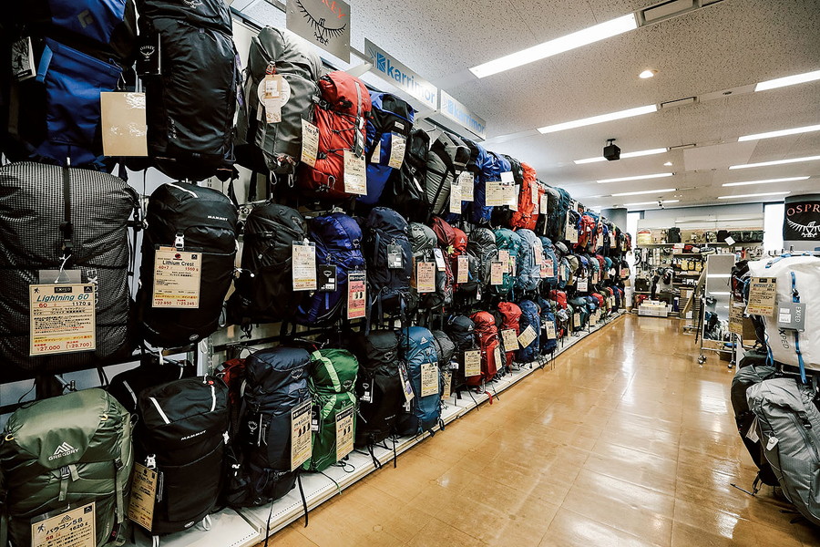東京神田にある老舗の登山用品店さかいやスポーツで、バーナーやクッカー、寝袋などのアウトドアギアを扱うのが「エコープラザ」だ。店内を見渡すと奥側の壁面に、さまざまな容量のバックパックがずらりと展示されている。その数、およそ150点。デイパックから縦走登山用の大容量モデルに加え、軽量バックパックを並べたコーナーも作られていた。