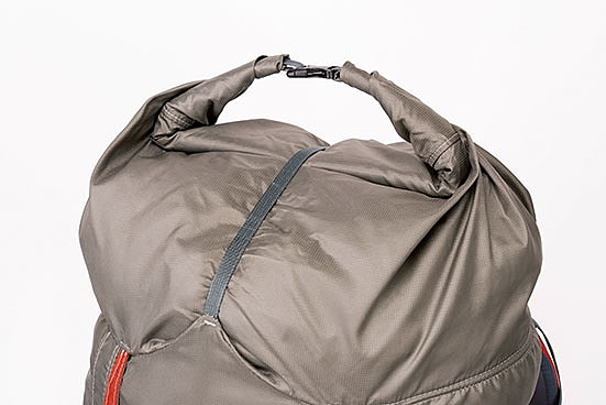 軽量バックパックの多くは本体上部の雨蓋(トップリッド)がなかったり、着脱式になっていて、開口部を巻き上げるロールトップを採用。