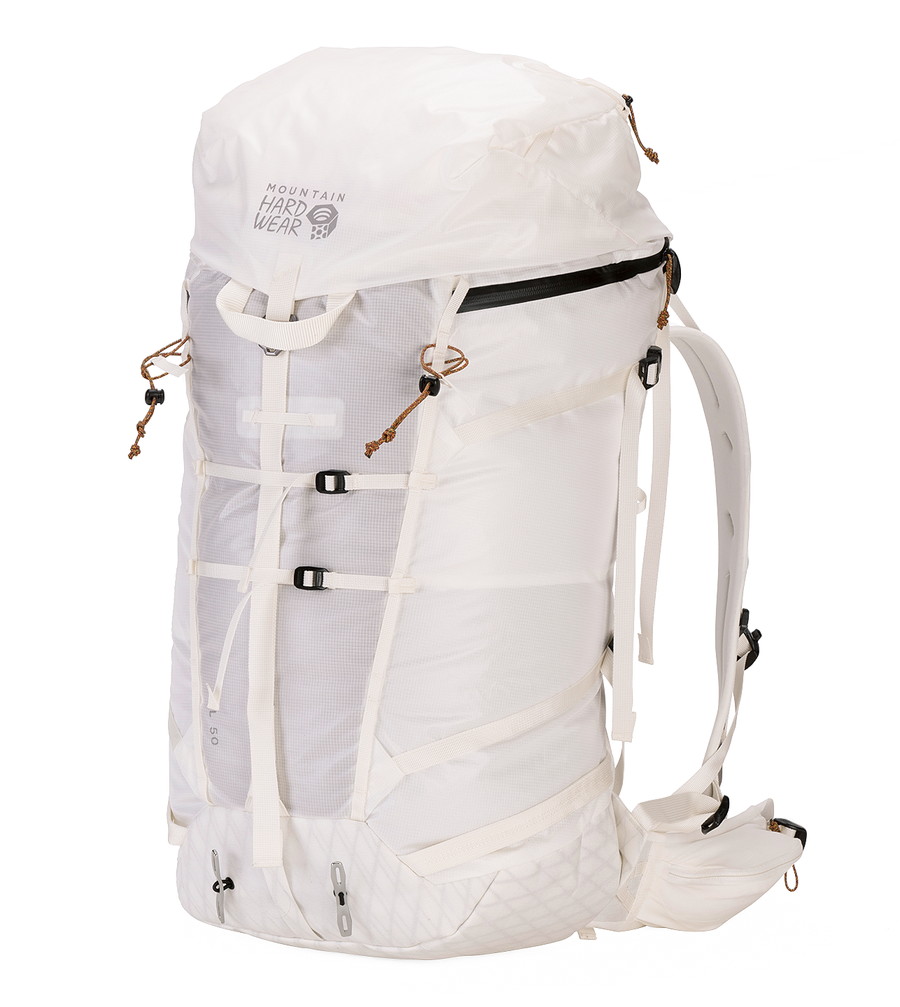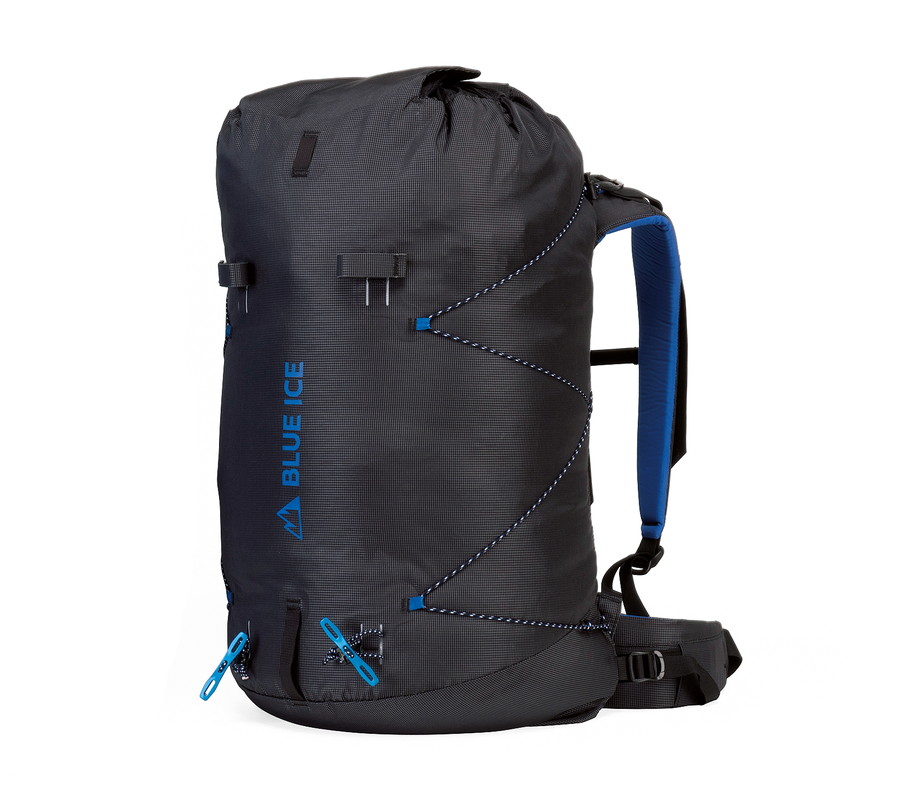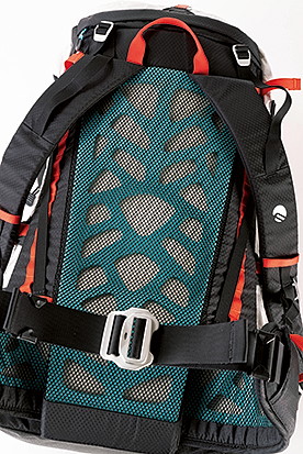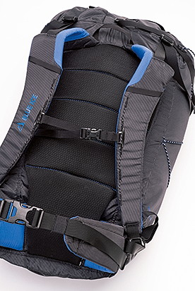 アイスアックスポケットやクランポン用ストラップなど必要不可欠な機能だけを備えて、簡素に仕上げられた中型クライミングパック。雨蓋や背面パネル、ヒップベルトに加えて、不要になったストラップ類なども取り外して軽量化することも可能になっている。