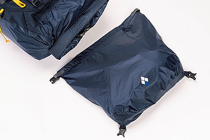 雨蓋を取り外しての軽量化も可能だ。その際の荷物の出し入れ口にはドローコードで閉じ、ロープなどを留めやすいフラップがつく。