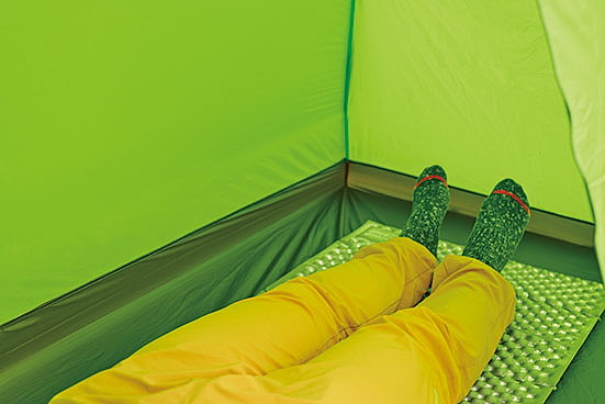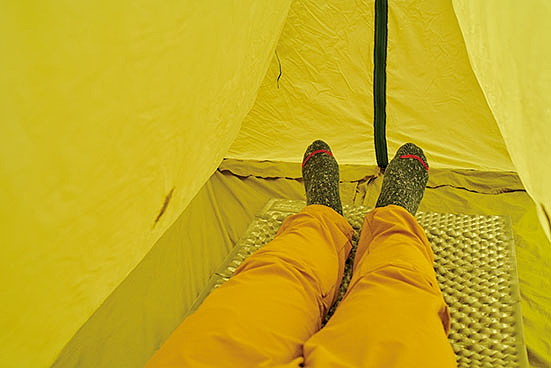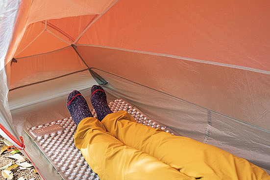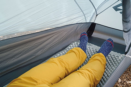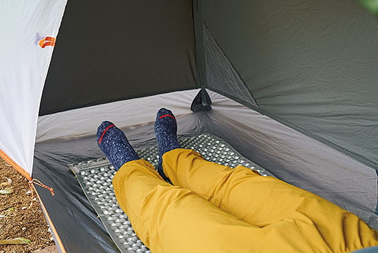 座った状態で頭上に十分な余裕があり、居住性は良好。ただし、足元付近の横幅がマットとほぼ同じサイズなので、少々狭く感じられた。足元に荷物を置くにはスペース不足か。