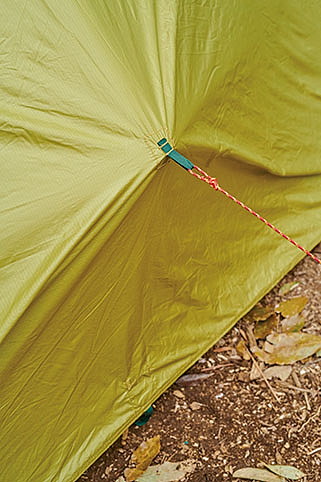 ビバーク時だけでなく、簡易テントとしても積極的に使用できる軽量ツエルト。撥水性だけでなく透湿性も高い生地が使われているので、不快な結露の発生が少ない。また、頂点を結ぶ頭上のラインに採用した、水分を含んでも伸びない高強度素材「イザナス」テープのおかげで、しっかりとテンションをかけて設営でき、高い剛性を得ることができる。