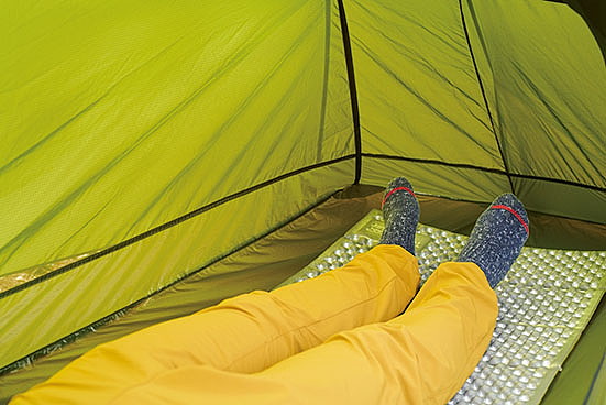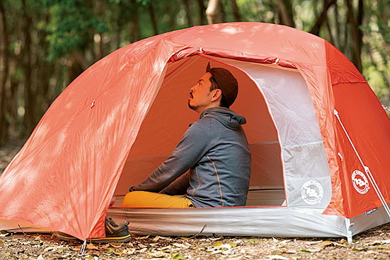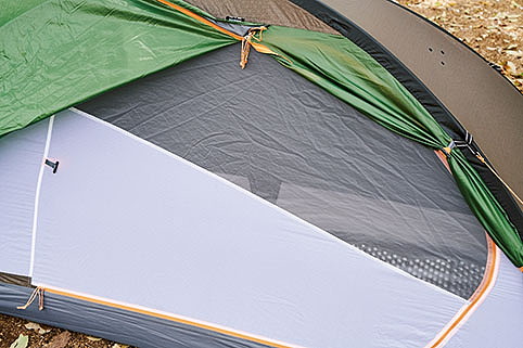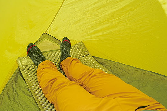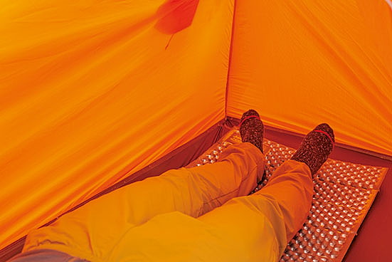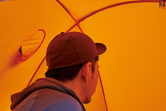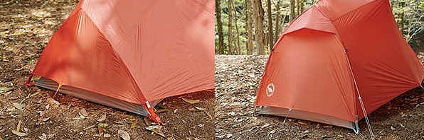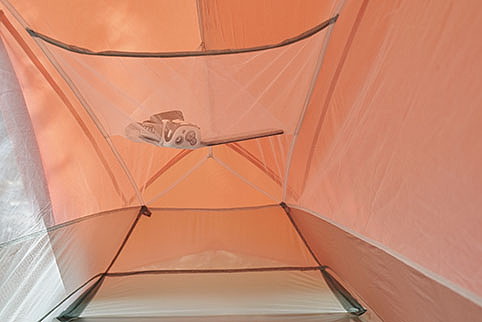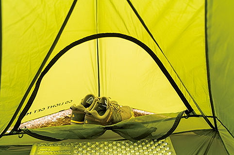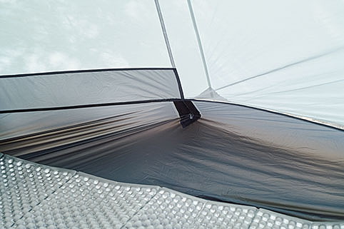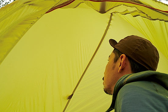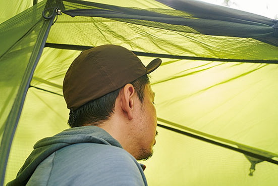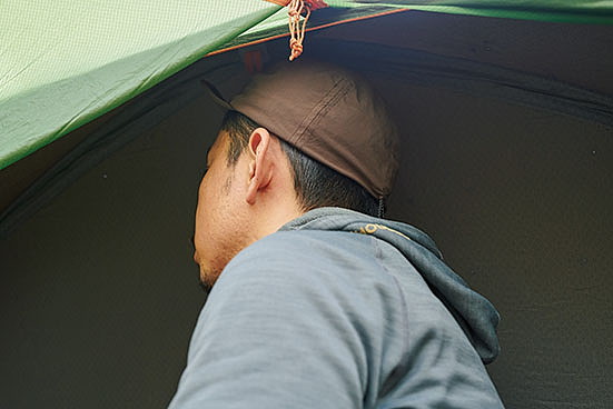 居住性の良さは言うに及ばず。天井までの高さには余裕があり、2人用なのでもちろんフロア面積も広い。唯一、横になると顔の付近に生地が覆いかぶさる感じがあった。