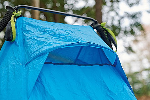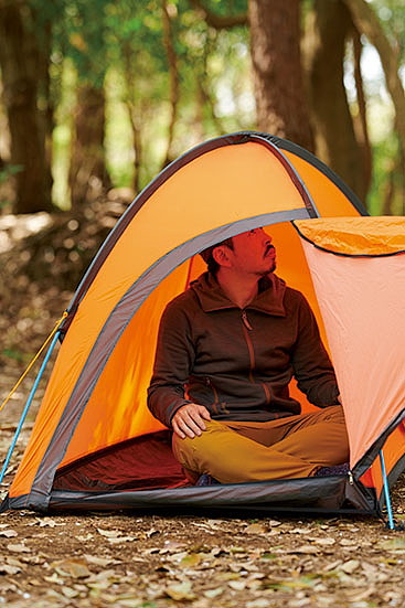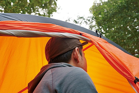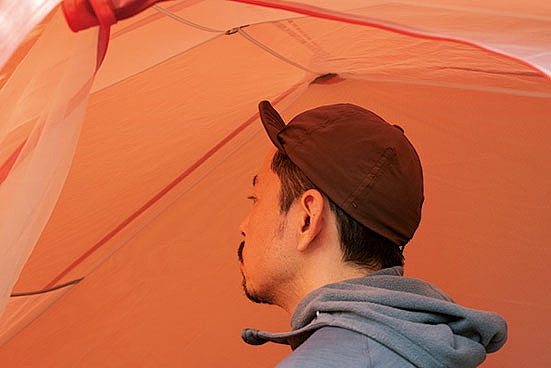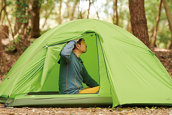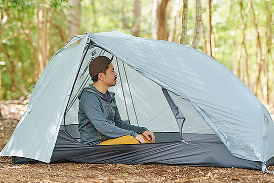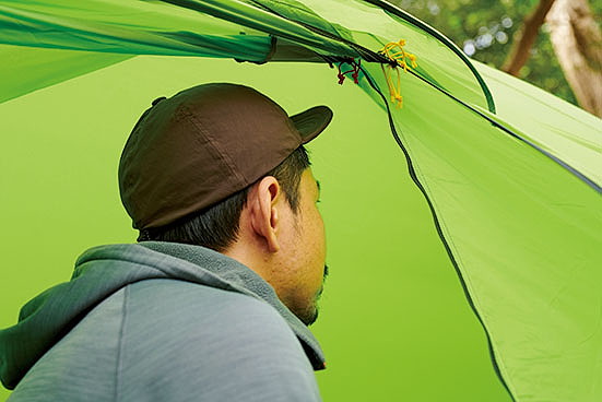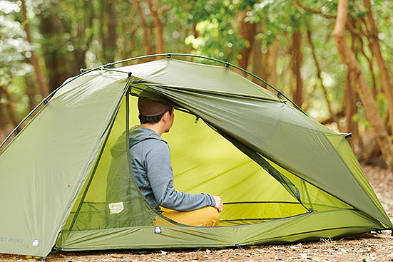 ダブルウォールだが、ポールにフライシートを取り付けるとインナーテントも同時に立ち上がる構造で、雨の日もインナーテントが濡れる心配がなく、フライシートを被せる手間もかからない。インナーテントに採用した優れた撥水性と通気性を併せ持つ「モノフィラメント」という特殊な生地によって、結露が発生しにくいという特長も見逃せない。