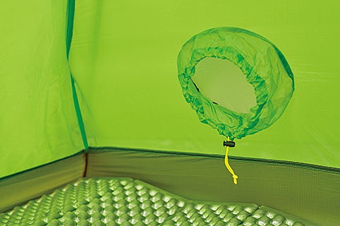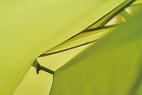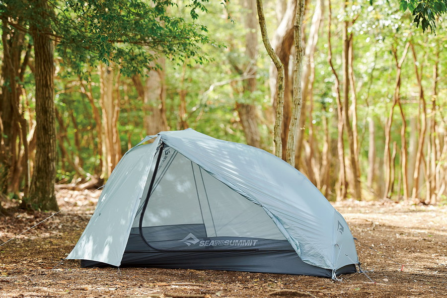 高機能なスリーピングマットやクッカーなどを多数展開するシートゥサミットが、今年から本格的に参入する山岳テントの最軽量モデル。頭上にあるポールがV字に張り出すめずらしい構造をしており、これによって天井と室内空間が広がるとともに、空気の循環を促すベンチレーションも得られる。インナーテントは通気性に優れるメッシュパネル。