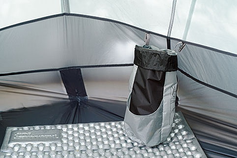 収納袋が小物入れに変身。ポールの収納袋を天井に取り付け、ヘッドライトを入れて室内を照らすこともできる。
