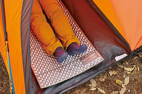 居住性の実証、設営は編集部員ヒジヤ(身長164㎝)が担当。「居住性」は天井までの高さと足元のスペースをチェック。足元の写真は頭が側壁に触れる状態で、幅51㎝、長さ183㎝のマットに横になっている。「設営タイム」は、袋から出して張り綱をペグダウンするまでに要した時間。これは慣れにも左右されるので、あくまで目安に。