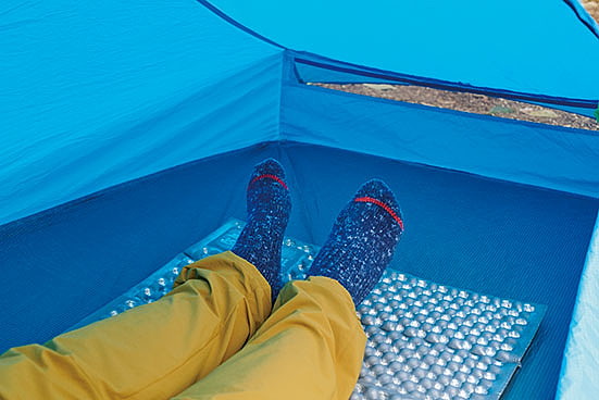 中に座ると天井に頭がついてしまい、窮屈な感じが否めない。しかし、フロア面積は1人用にしては広々。足元やマットの左右に荷物を整理するスペースを十分に確保できる。