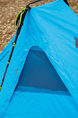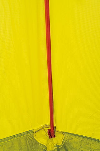 「テント」ではなく「ツエルト」に分類されるモデルだが、センターポールのおかげで一般的なツエルトよりも居住性ははるかに高い。設営も簡単で、ポールを取り付けてから両サイドをペグダウンするだけで立ち上がる。縫い目をシームテープで処理しているので防水性は申し分ないが、高い気密性があるので使用には十分な換気が必要だ。