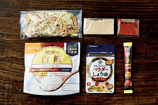 山で始末の悪いしょうゆも、粉末にすれば軽量&液漏れなし! 味の決め手は粉末牛肉だし。大豆ミートと玉ネギにコクを与える。