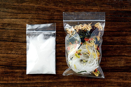 春雨とそのほかの乾燥系の食材は1食分をまとめて小袋に収納。すしの子を多めに持っていくと、ほかの料理のアレンジに使える。