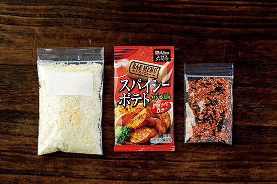 乾燥具材はいっしょに戻すのでひとまとめに。塩とブラックペッパー、パルメザンチーズは、それぞれ小分けにしておくと使いやすい。