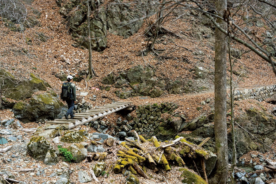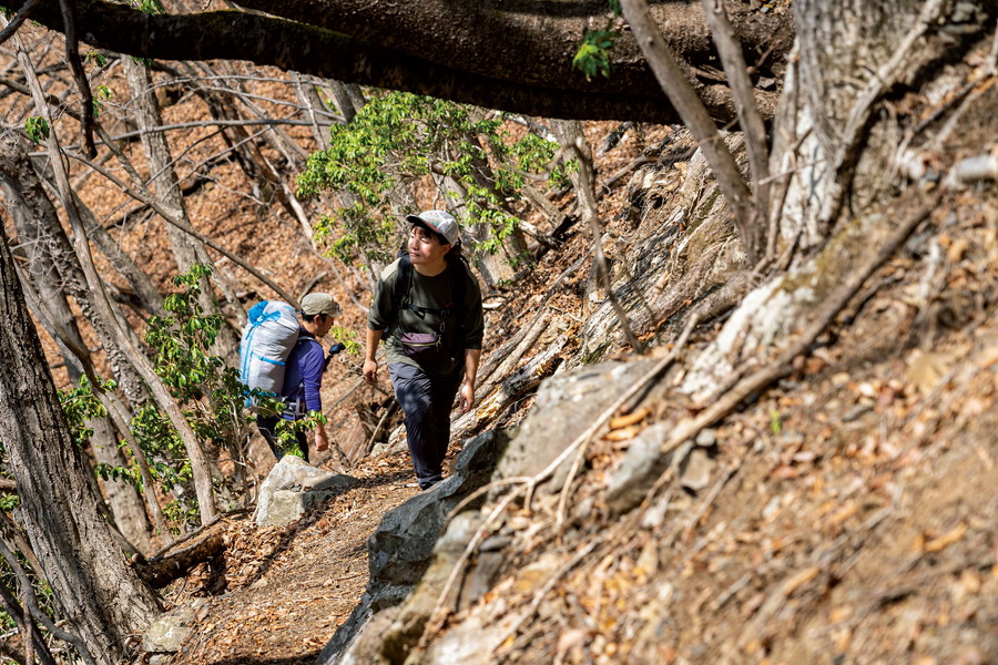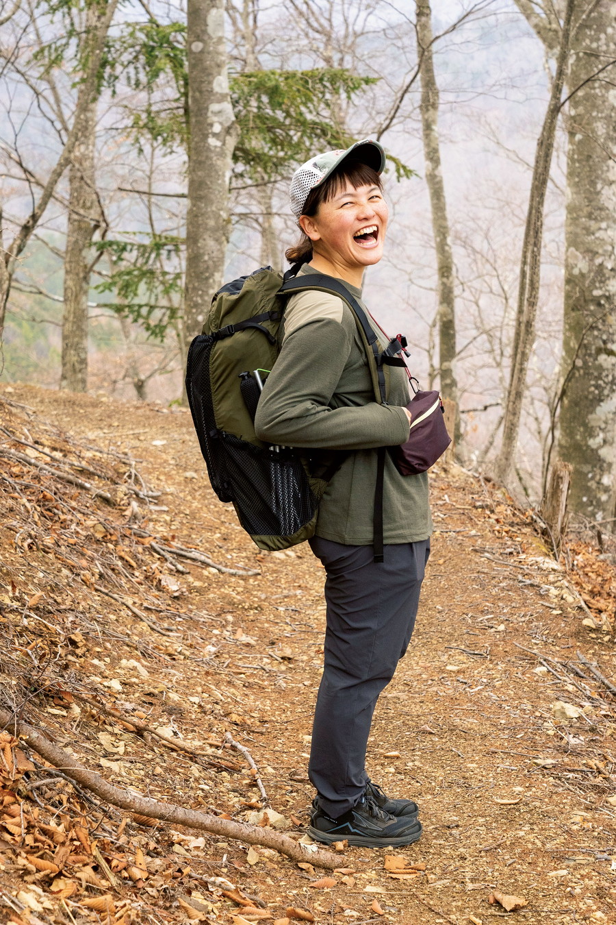 歩き出して1時間。道の傾斜がきつくなってきたが、ニノミヤのペースが落ちない。中高年の森山と、軽量化が下手でなぜか20kg超も背負っているカメラマンがバテているのを尻目に、ニノミヤは平地のようなペースでずんずん登っていく。これはウルトラライトの効果なのか、それとも彼女の体力ゆえなのか判断はつかないが、どうですか?