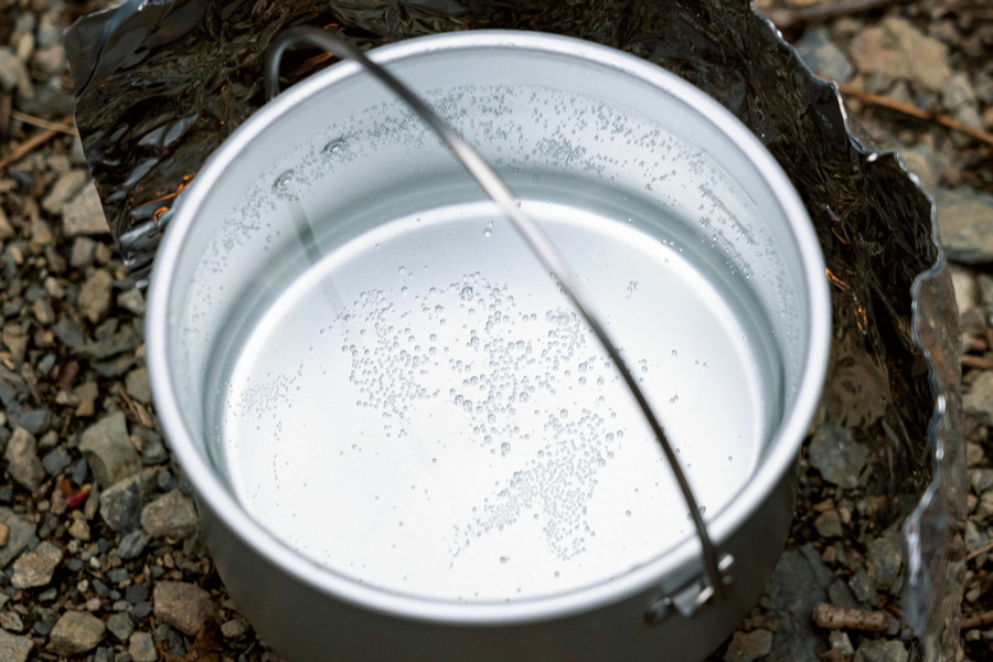 ニノミヤが取り出した炊事用具は小さなアルミクッカーひとつだけ。燃料もコンロもカップもライターも、全部これに収納できている。熱源は固形燃料。それを乗せるコンロというかゴトクは、わずか15ℊ。これも笑っちゃうくらい小さくて軽い。ただの金属片のようだ。