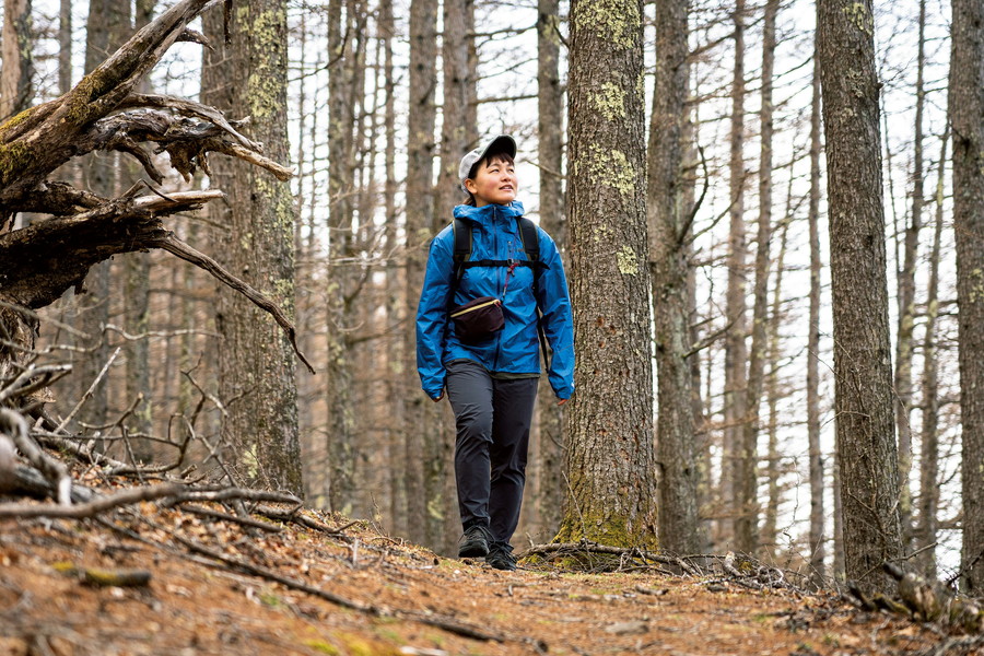歩き出して1時間。道の傾斜がきつくなってきたが、ニノミヤのペースが落ちない。中高年の森山と、軽量化が下手でなぜか20kg超も背負っているカメラマンがバテているのを尻目に、ニノミヤは平地のようなペースでずんずん登っていく。これはウルトラライトの効果なのか、それとも彼女の体力ゆえなのか判断はつかないが、どうですか?