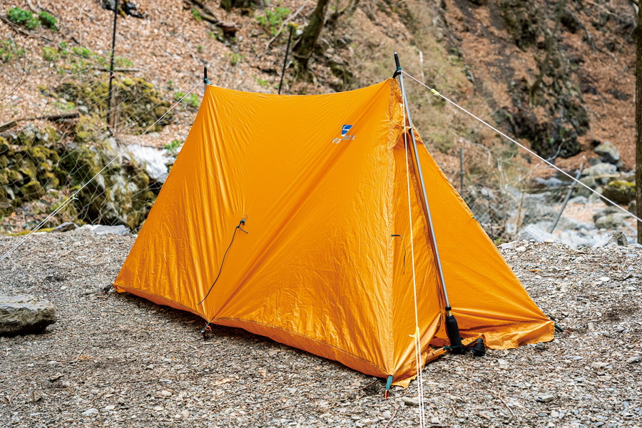 今回の寝床はツエルト。現在は500gほどの超軽量テントもあるが、そのさらに半分ほどの重量で、今回もっとも軽さを攻めたチョイスといえるだろう。