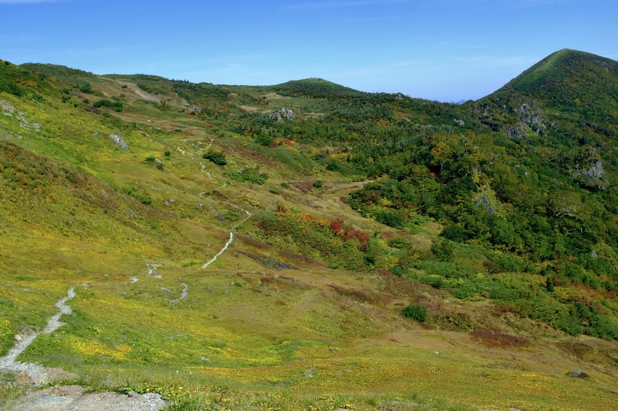 ひさしぶりの重い荷物を背負ってのロングハイク。蓮華温泉から朝日岳山頂までは、ほとんどが登りに続く登り。立ち止まっては木々を眺め、立ち止まっては道を確認し、立ち止まっては地図を見てあとどれほどこの坂が続くのかとうなだれ、一向に進みません。