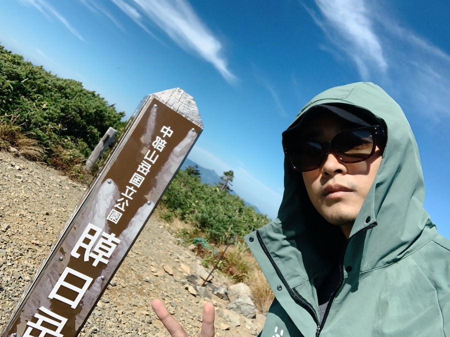 朝日岳の頂上でパシャリ。ご覧のとおりの真顔。自分でもびっくりです。疲れもピークにきていたのでしょう。