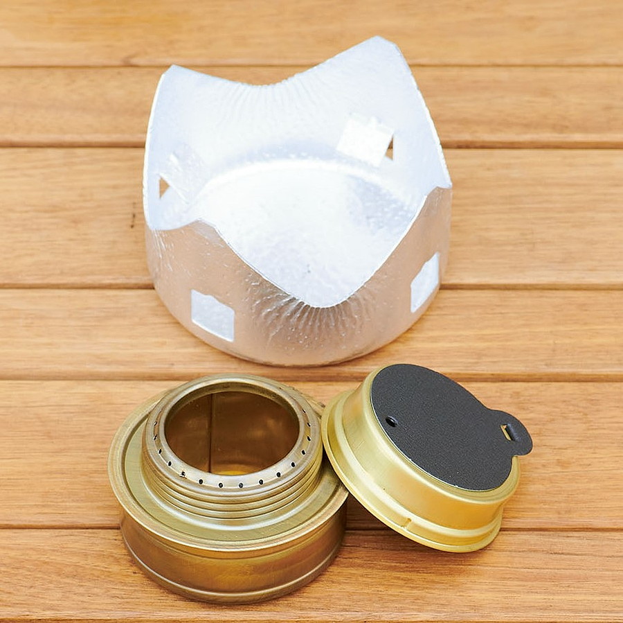 素材は真鍮。熱伝導率が高いので短時間で本燃焼がはじまり、低温下にも強い。付属のパーツで火力を調整可能。タンクの2/3の燃料で約25分間燃焼する。別売の専用のゴトクは本体を中に入れて使用する。
