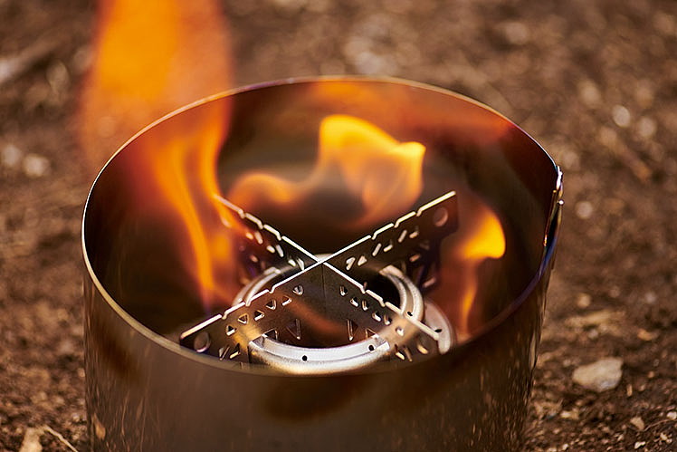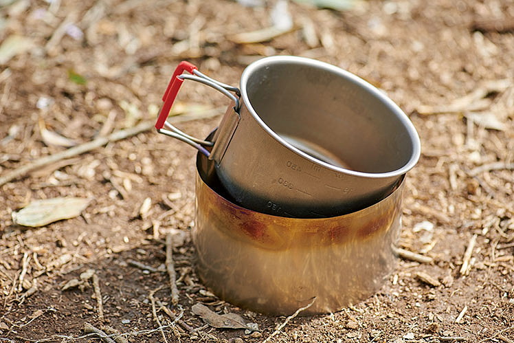 チタン製の軽量バーナー。外周の穴からも炎が出る構造で本燃焼までの時間が短くなり、強い火力も実現。内側に刻まれた一目盛り30㎖で約5分間燃焼する。別売のゴトクは十字に組み立てて本体に被せて使う。
