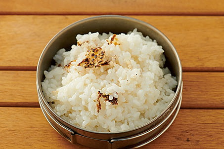 グルメな人は山で生米を炊いたりする。そんな食通をよそおって固形燃料で炊飯してみると、失敗するかと思いきや、意外と芯は残らずに炊きあがった。ただし、おいしいかと聞かれると正直微妙。ボソボソしていて、食べられなくもない、といった味だった。