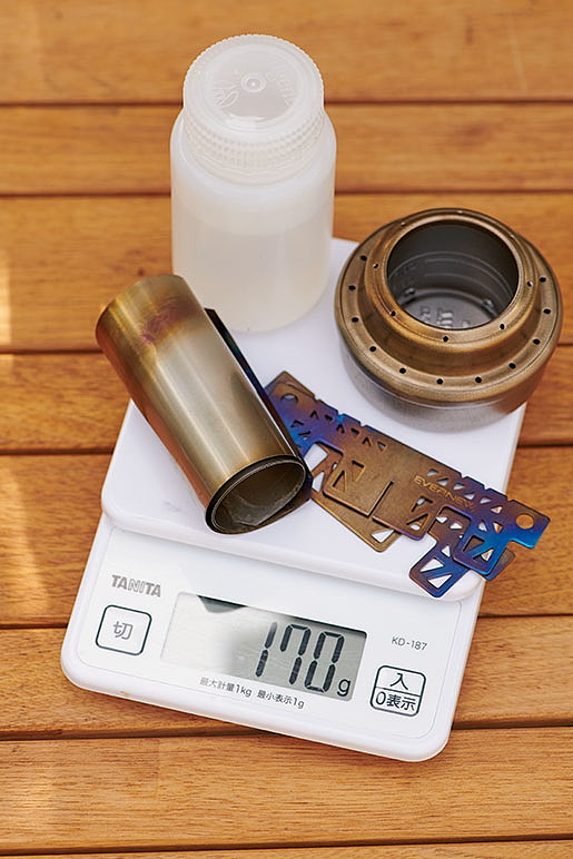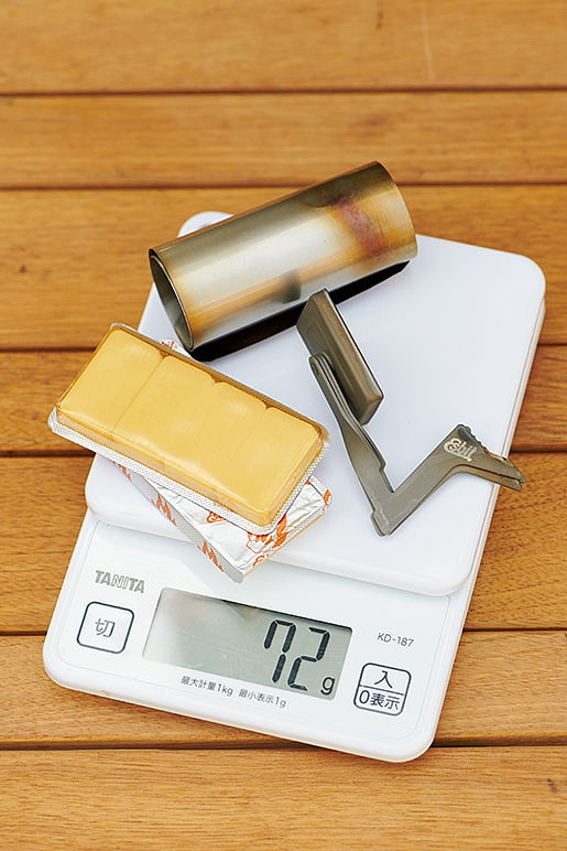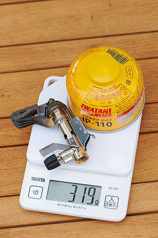 気になる重量は1泊2日を想定して計量してみた。バーナー本体と燃料を基本として、必要なものには、ゴトク、風防(15g)、燃料ボトル(24g)の重量が加わっている。燃料の重さは1食分400㎖のお湯を2回沸かせる分量として、アルコールは80g、固形燃料は40gとした。これは気温などに左右されるので、あくまで目安として捉えてもらいたい。ガスバーナーの燃料には満タンの110サイズのガスカートリッジを用意した。