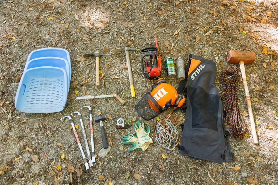 使うのは背負って持っていけるくらいの軽量な道具のみ。実際にはカゴに入れ背負子で現場へと持っていく。小型のチェーンソーは丸太の伐採、ハンマーのような掛矢(かけや)は木柵の固定のため、バールやツルハシは土を採掘、カゴのような石みは土砂をすくうため、ロープやスリングは資材を引きずるために使用。