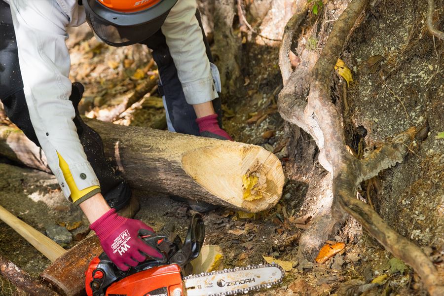 ステップに必要な丸太は現場付近の枯れ木を使用(事前に役場で伐採許可を取っておく)。倒れる場所を考えながら必要な長さをチェーンソーでカットし、現場まで持っていく。そこまで太い木ではないので、女性でもラクに持っていける。