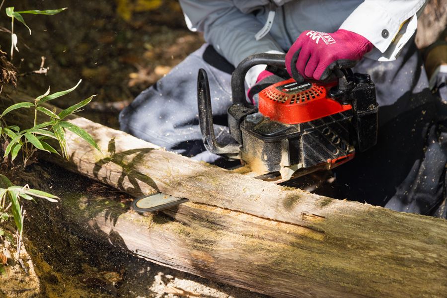 丸太は玉切りしたままではフィットしないので、水が流れても動きにくいように角を落とすなどチェーンソーで加工する。表面も足が滑りにくいように平らにカット。これは高い技術が必要なのでチェーンソーの扱いに慣れている人が行なう。