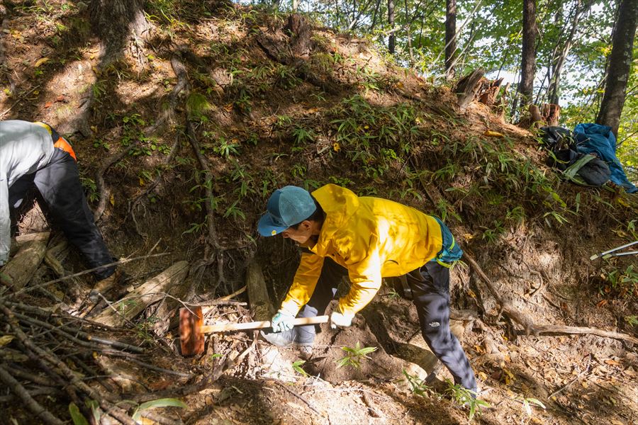 枝で埋めたステップも実際には中は空間だらけ。登山者が歩くとどんどん潰れていくので、掛矢で表面を叩き、空間を潰していく。するとどんどん表面が下がっていくので、さらに枝を追加。最後に土砂を投入して完成させる。