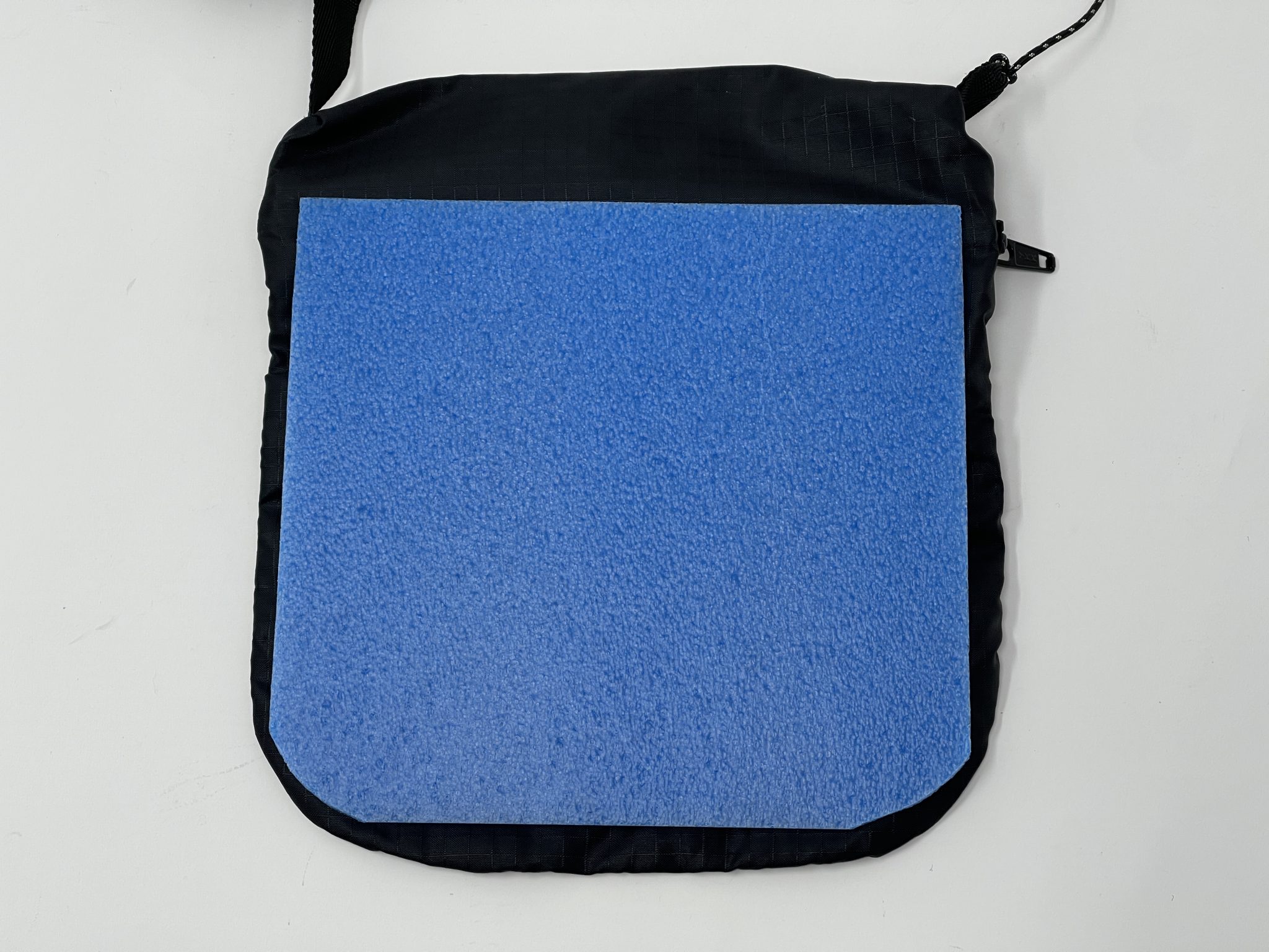 シートを入れたいサコッシュの大きさに合わせて芯材となるPPシートをカットして、そのPPシートを型紙にしてナイロン生地を裁断、あとは入れたいアイテムの大きさに合わせたゴムを縫い付けていくだけです。