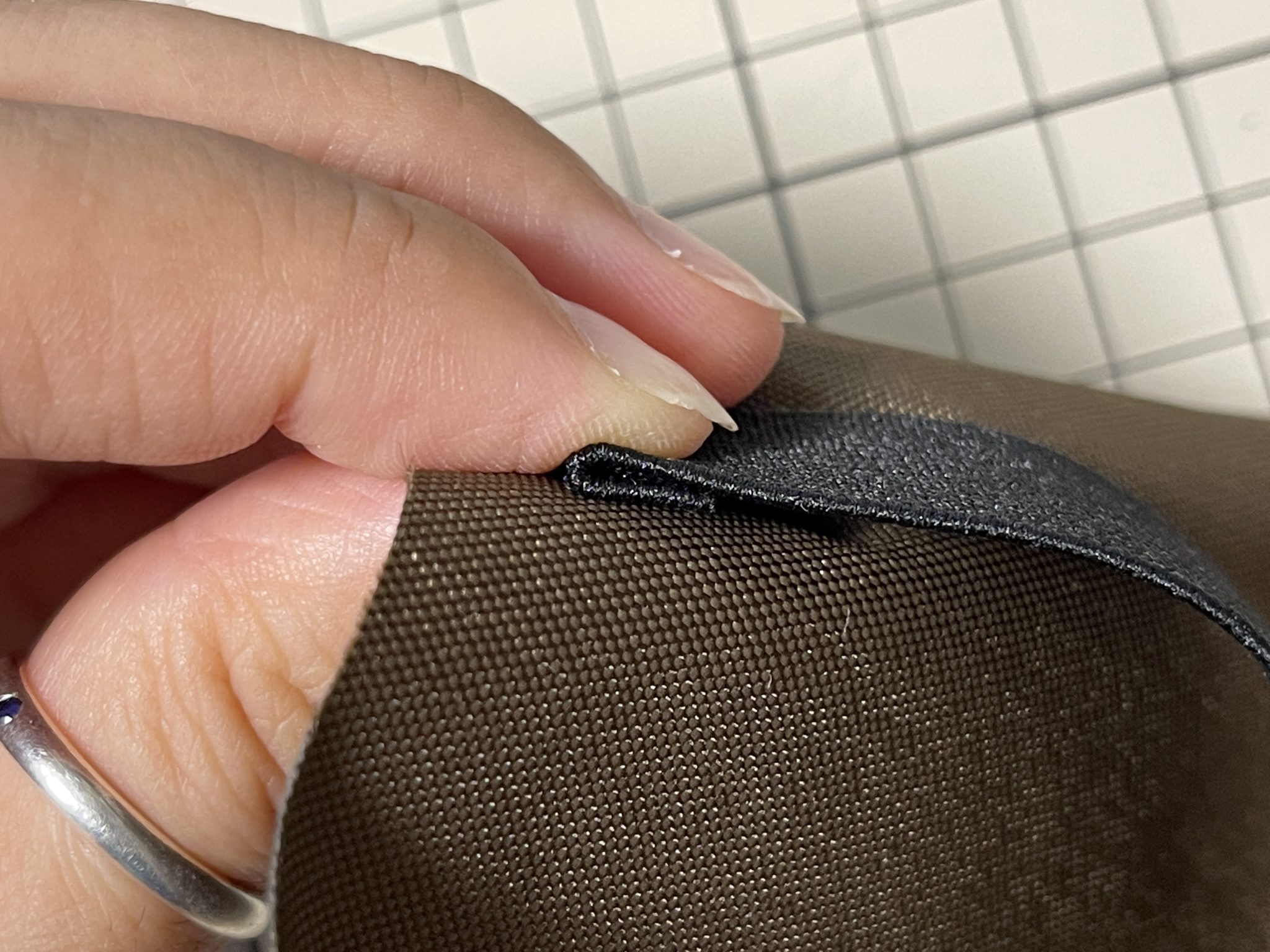 4.ゴムの端はライターで炙ってから織り込んでミシンで縫う。端は2回くらい縫い止めておくのがおすすめ。