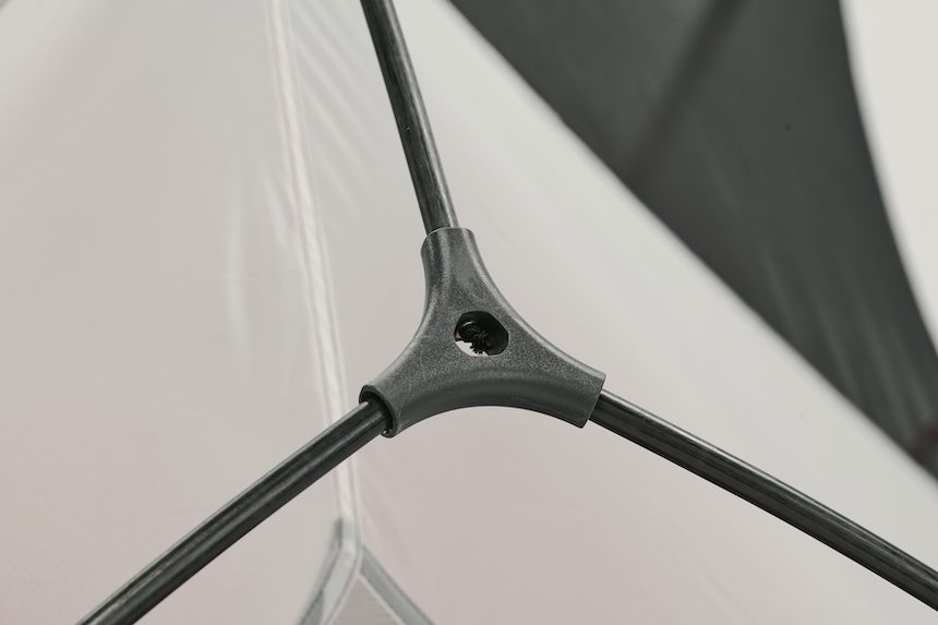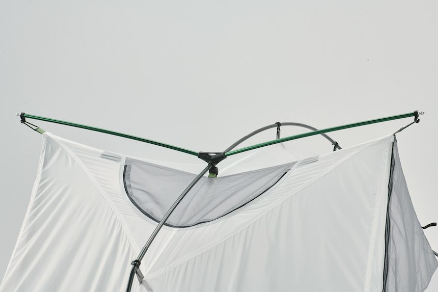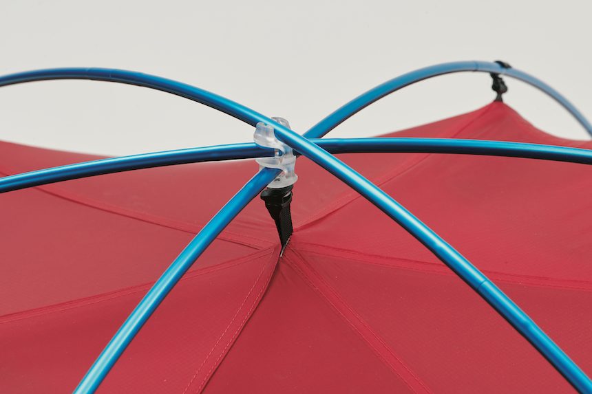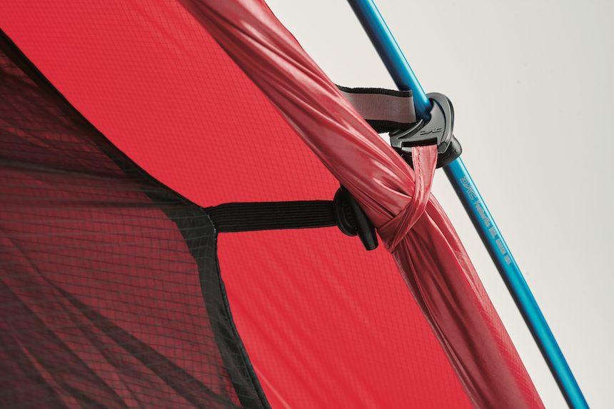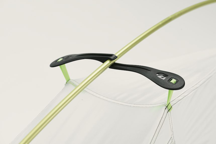 ▲新しく取り入れた「ティップロックテントバックル」は、設営時に差し込んだポールが抜けてしまうのを防ぐなど、使い勝手を第一に考えた部材だ